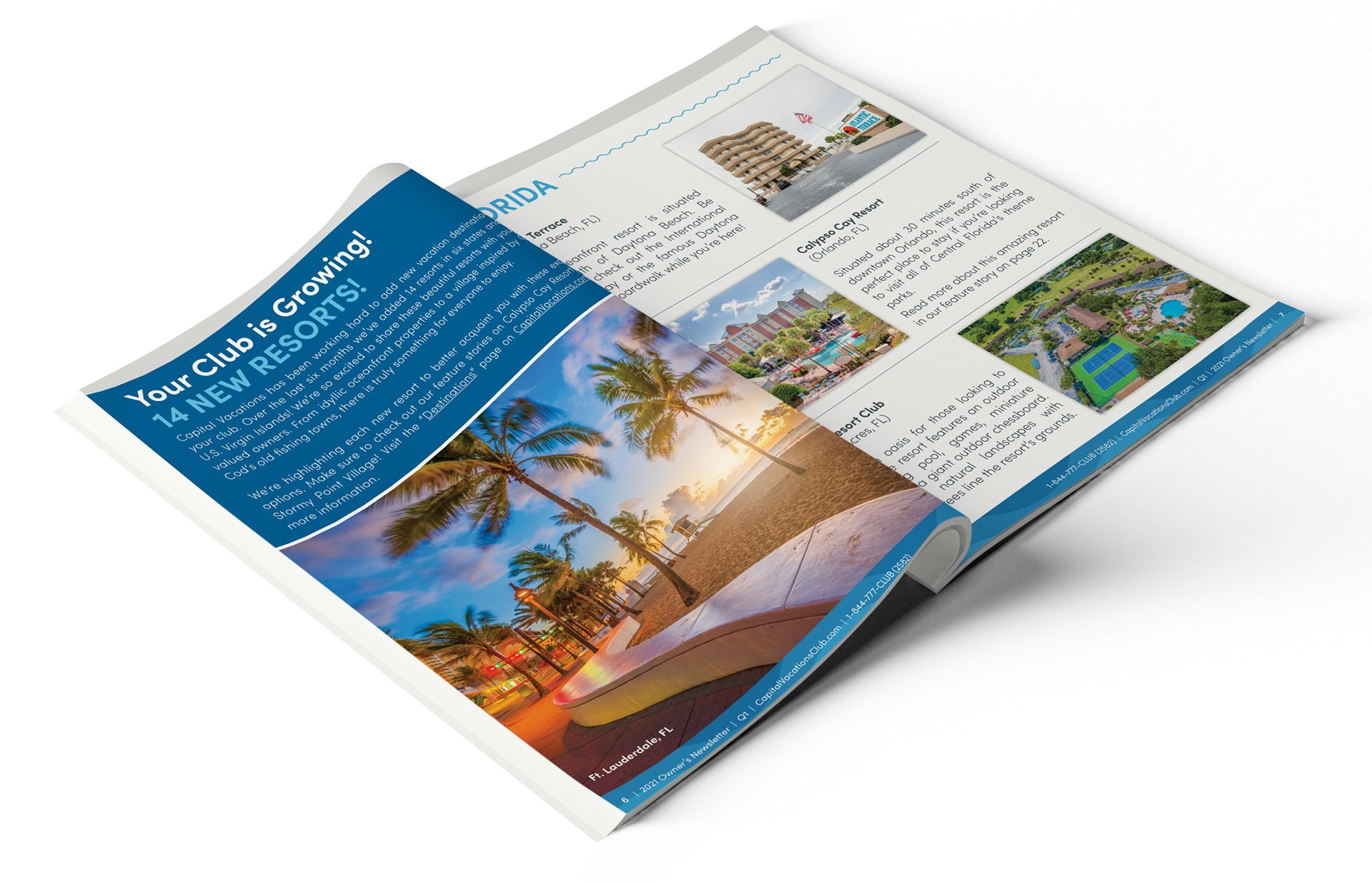 As the lead creative force behind Club Connection Magazine, I spearheaded a strategic redesign in response to Capital Vacations' rebranding efforts and the evolving preferences of our audience. This initiative aimed to realign the magazine's content, design, and overall appeal to better resonate with the updated brand identity and the expectations of the new target audience.
