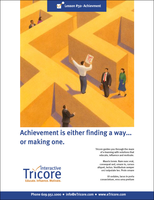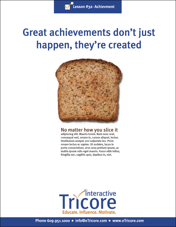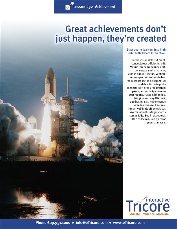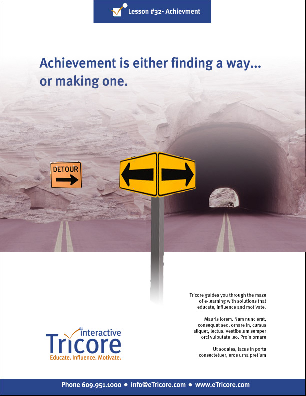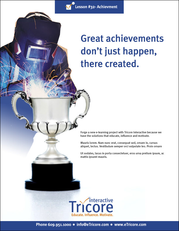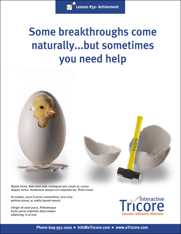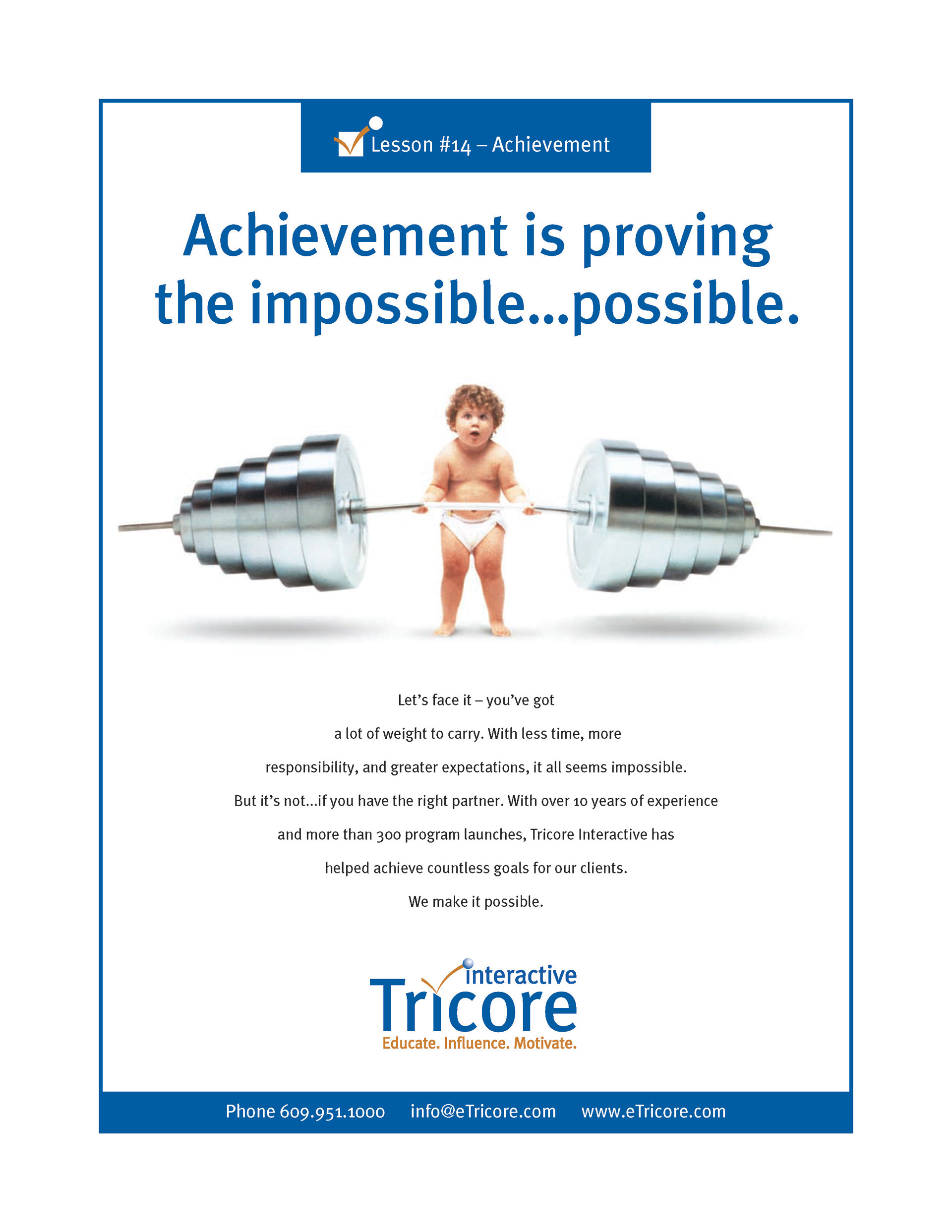 After meeting with the owners of the business to clarify the goals of the advertisement and to better identify the position of Tricore Interactive within the life sciences training industry a creative brief was defined. The basis of the creative brief we defined as equating Tricore Interactive differentiators as and imply with the copy this is what Tricore can do for you. We also choose to insert a subtle humorous approach into ideation (fun) which would be used as the eye-catchy hero visual to attract attention. We also agreed to keeping the visual look of the advertisement would be straightforward, meaning simple and quick in its visual communication style with a dominant ‘hero’ image and headline.