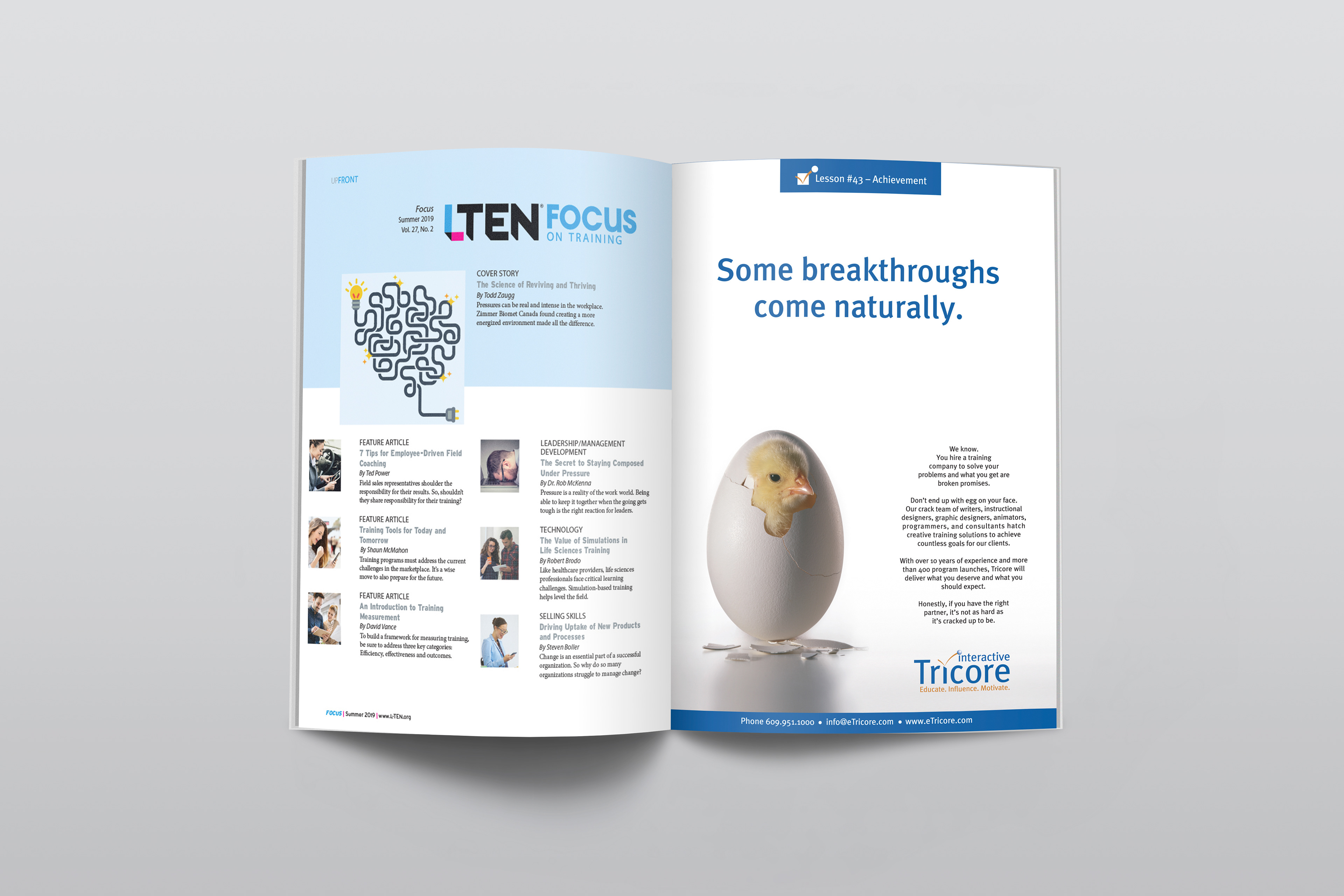 Create an advertisement to differentiate the services of Tricore Interactive, a life sciences training company within the healthcare training magazine LTEN Focus on Training magazine.